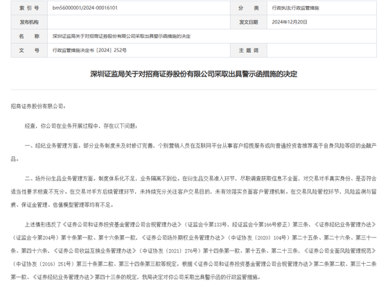 2024年12月,招商证券因经纪业务制度未及时修订、场外衍生品业务隔离不到位等,被深圳证监局出具警示函。