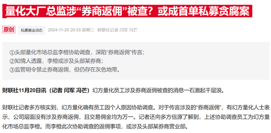 彼时,行家通过财联社报道得知,幻方量化承认市场总监李橙因个人原因协助调查,并回应称为个人事务,与公司无关,“公司层面不存在券商返佣问题,交易佣金均为万分之一”。