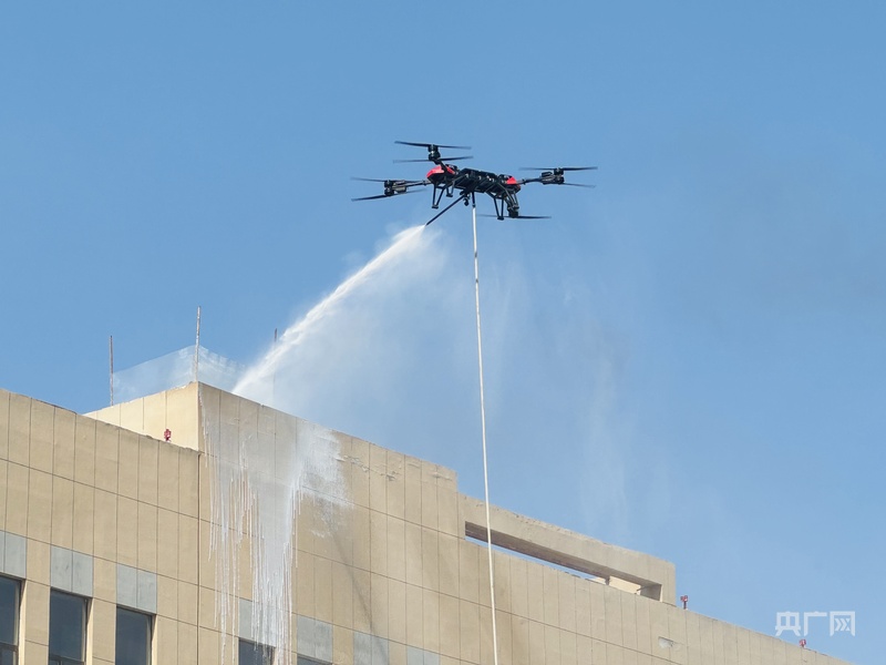 演练现场,无人机灭火后返回(央广网记者 刘晓祺 摄)